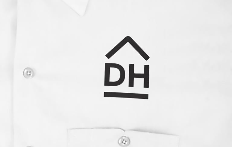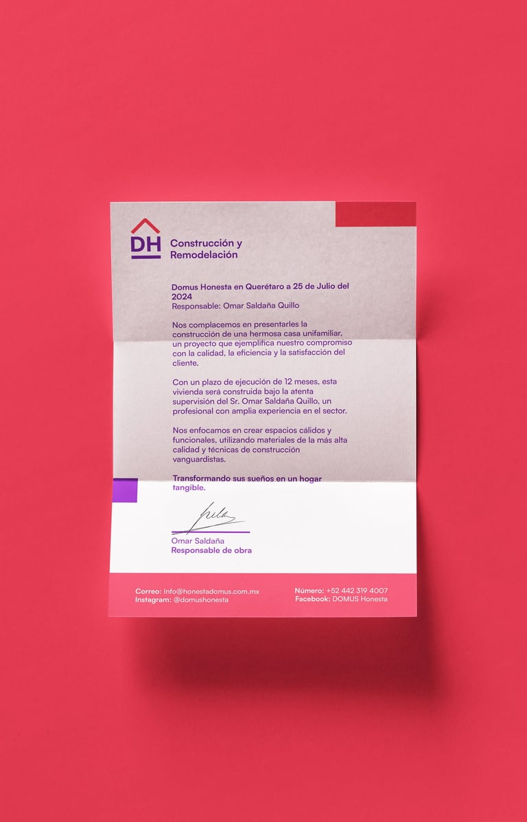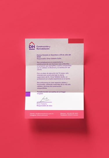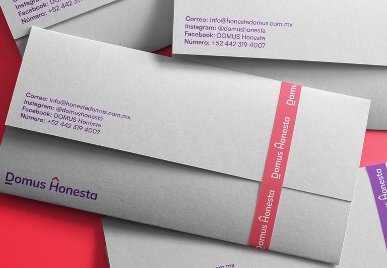 El logotipo fue diseñado como un isologo, unificando símbolo y texto para formar una sola entidad gráfica coherente y poderosa. La palabra “Domus” fue intervenida con una línea base dentro de la “D” que representa simbólicamente los cimientos seguros sobre los que la empresa construye. En la “H” de “Honesta” se integra un medio cuadrado inclinado en color rojo que hace alusión a una casa, reforzando visualmente el rubro de la marca.
